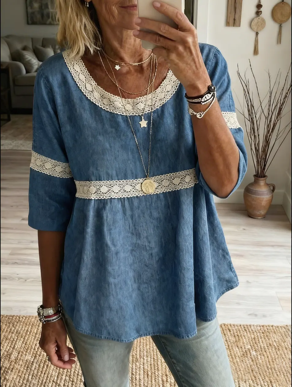 Women's Casual Round Neck Lace Patchwork Top